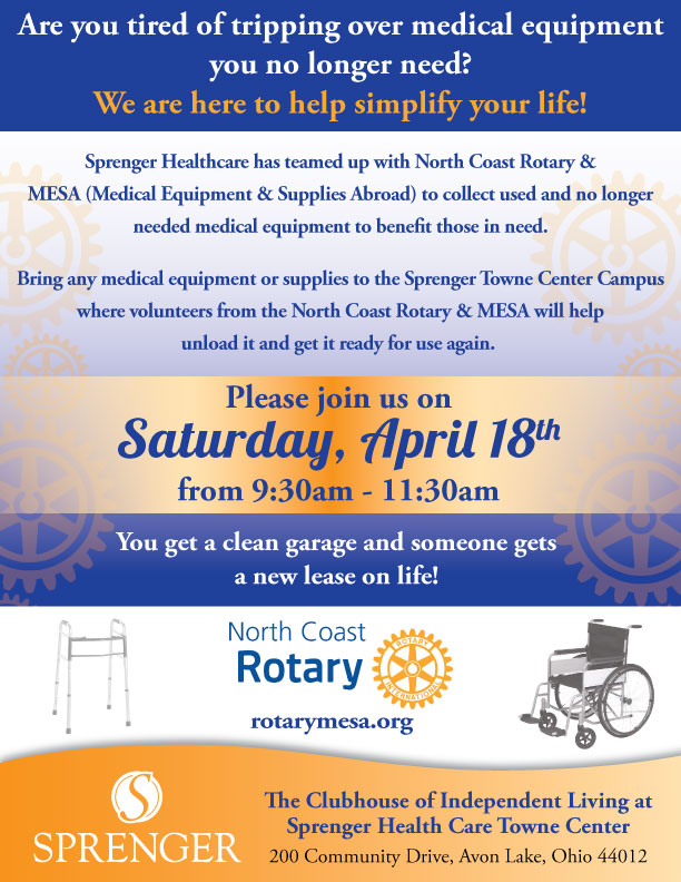 North Coast Rotary typically organizes several collection drives each year. Recently Sprenger Healthcare in Avon Lake has collaborated with us to facilitate storage and collection of donated items. See our 2026 collection information below: