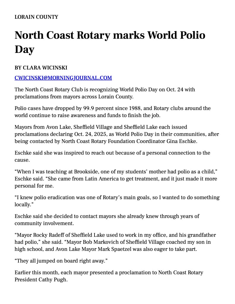 North Coast Rotary club members have contributed close to $1000 over the past 5 years to the Rotary Foundation Polio Plus fund. In 2025, Foundation Coordinator Gina Eschke secured three mayoral proclamations recognizing World Polio Day. Avon Lake Mayor Mark Spaetzel, Sheffield Lake Mayor Rocky Radeff and The Village of Sheffield Mayor Bob Markovitch each issued a proclamation encouraging support of polio eradication efforts.