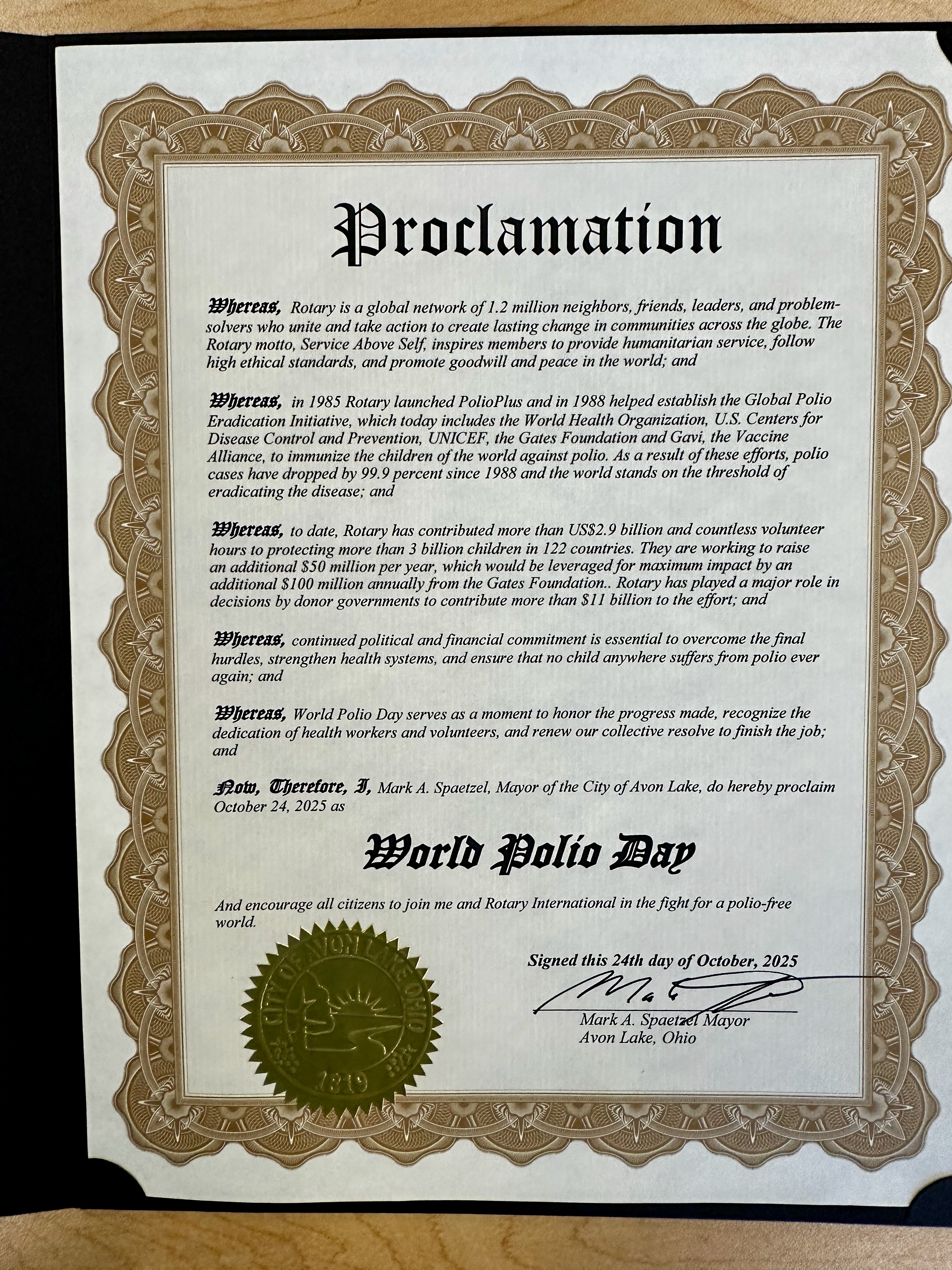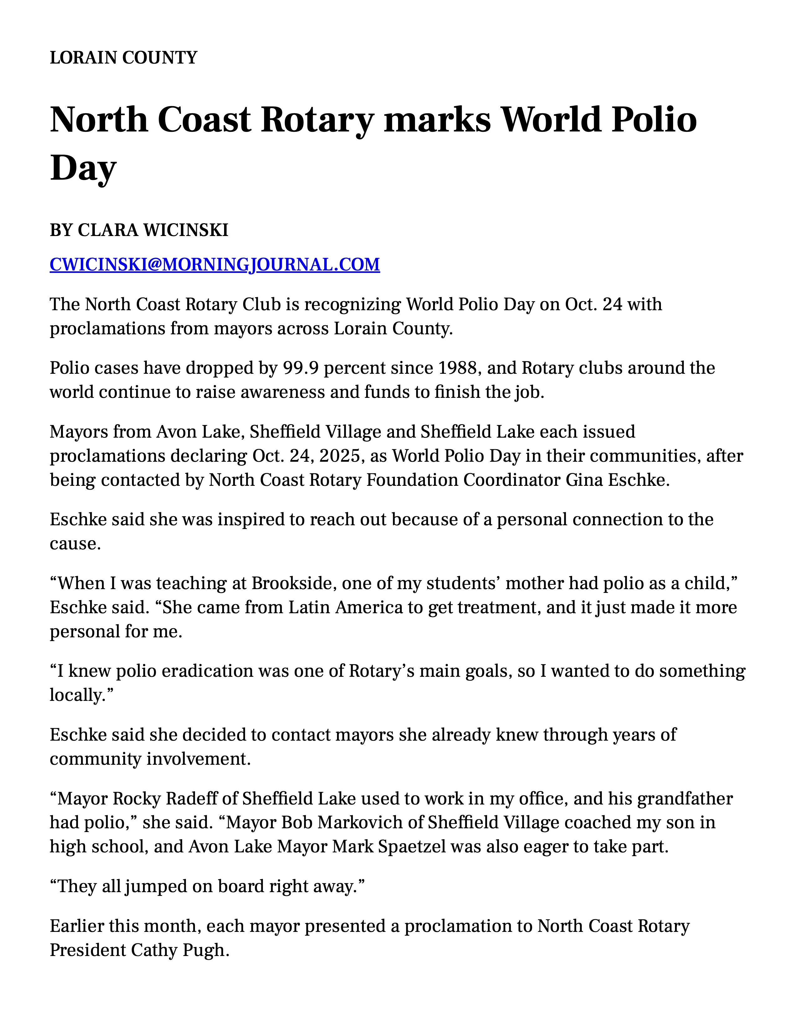North Coast Rotary club members have contributed close to $1000 over the past 5 years to the Rotary Foundation Polio Plus fund. In 2025, Foundation Coordinator Gina Eschke secured three mayoral proclamations recognizing World Polio Day. Avon Lake Mayor Mark Spaetzel, Sheffield Lake Mayor Rocky Radeff and The Village of Sheffield Mayor Bob Markovitch each issued a proclamation encouraging support of polio eradication efforts.